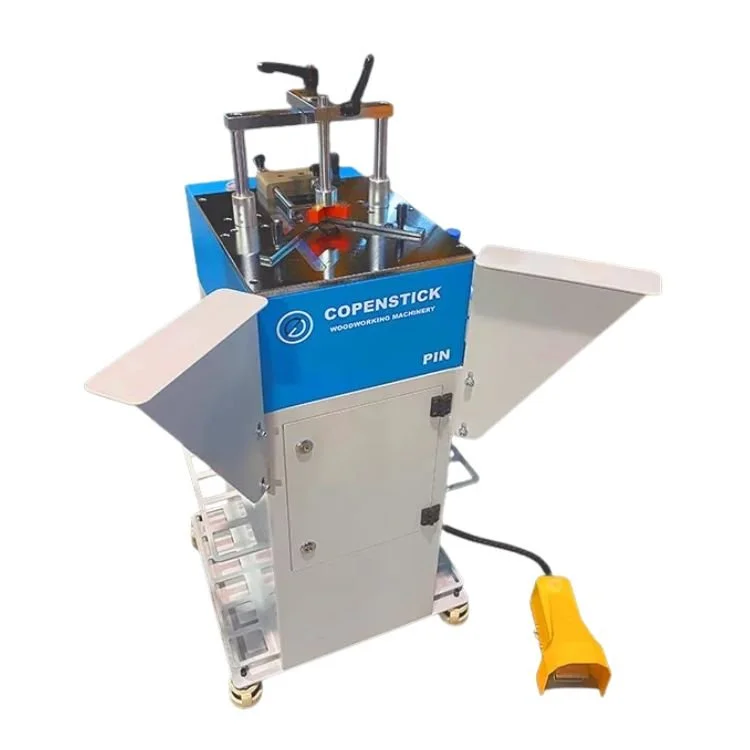 Foot‑Pedal Pinning — Depress pedal; underpinner drives nail(s) from underside through both mitred halves.